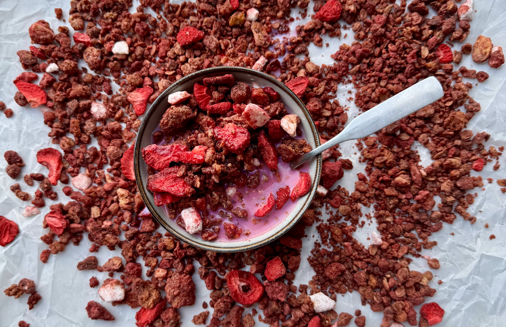 Toasted sticky bun pieces, oats, caramelized white chocolate, meringue crunchies, freeze-dried strawberries. veg, contains nuts